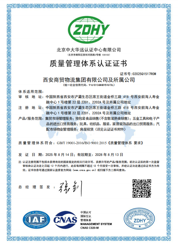 近日,西安商貿(mào)物流集團及所屬公司獲得ISO9001質(zhì)量管理體系認證證書。這是集團組建成立后在推進戰(zhàn)略規(guī)劃、塑造品牌形象、提升國內(nèi)外綜合實力進程中的又一重要成果,標志著集團在國際化、制度化、規(guī)范化管理方面邁上新臺階。