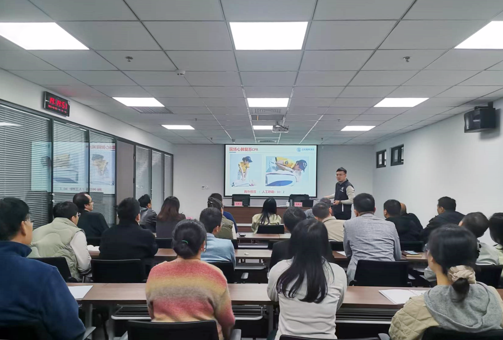 講座邀請到了安全健康教育網(wǎng)陜西站教科主任張肅毅授課。講師結(jié)合真實案例,從職工實際需求出發(fā),聚焦應(yīng)急救護、職業(yè)病防護、職場心理健康三大核心模塊分層講解。在應(yīng)急救護方面,細(xì)致拆解心肺復(fù)蘇的操作要點,幫助大家真正掌握關(guān)鍵施救技巧;結(jié)合伏案工作特性,量身定制“正確坐姿+定時拉伸+規(guī)律運動” 的防護組合策略;針對工作生活中易發(fā)的負(fù)面情緒,傳授識別、疏導(dǎo)實用技巧,引導(dǎo)大家以積極心態(tài)應(yīng)對挑戰(zhàn)。